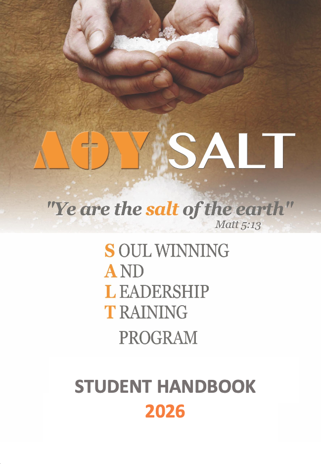 Following up from the AOY conference in December 2013 which sought out youthful labourers for the Master’s vineyard, AOY SALT was born to train and mobilize these armies of workers to be God’s helping hands. AOY SALT is an evangelistic school that provides young people with an avenue to join mission work and test out their calling for ministry. SALT is committed to raising up those who are called to win souls in their communities and serve as a Bible worker for local churches.